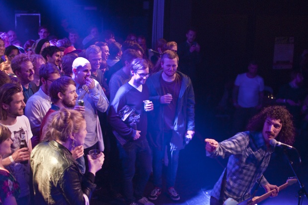 Det vidste langt størstedelen af publikum dog ikke, da klokken nærmede sig midnat på Atlas, og den slackede Dougman hev guitaren frem. Og heldigvis for dét – koncerten med den amputerede version af Swearing at Motorists var nemlig i langt mindre grad en opslugende musikalsk oplevelse end et virkelig sjovt møde med en fyr, som publikum havde alverdens sympati for og på al tænkelig vis ønskede at hjælpe godt igennem koncerten på egen hånd.