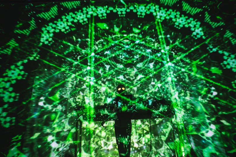 Det var uden nogen større viden om, hvad jeg kunne forvente mig, at jeg gik ind til Flying Lotus’ koncert. Hans setup så tilforladeligt simpelt ud, med en DJ-pult gemt væk bag et gennemsigtigt hvidt lagen, der adskilte ham fra publikum. Men det simple setup skulle man ikke lade sig narre af. Koncerten kom flyvende fra start, med de mest overdådigt overlegne visuals, jeg længe har set. Jeg skal helt tilbage til Chris Cunningham på Roskilde Festival 2011, for at mindes en mere gennemført visuel koncert. Ellison entrerede scenen iført en fluemaske med snabel og kæmpe lysende gule øjne, der fungerede som visuelt pejlemærke gennem en stor del af koncerten. Det hvide fortæppe, der hang mellem publikum og Ellison, gav koncertvisualsne et syret tredimensionelt look, da der både kørte videoer på bagskærmen og forskærmen.