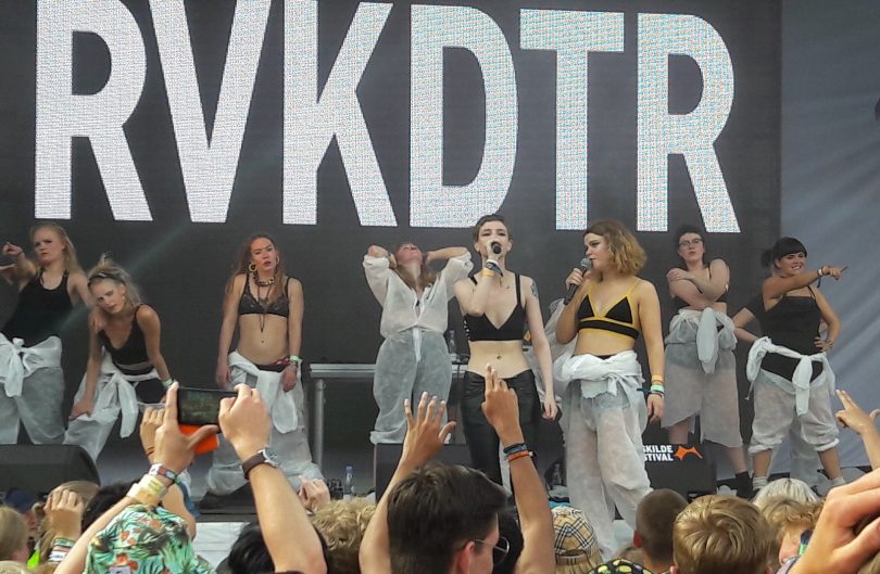 Tirsdag eftermiddag var Reykjavíkurdætur sat til at lave en fest på Countdown. Det gjorde de virkelig også! Allerede da dj’en gik på under det store RKVDR-banner, jublede publikum – rygtet om den viltre islandske gruppe havde spredt sig. Hovedpersonerne kom ind til beatet fra ”Ógedsleg”, og der var fuld knald på attituden fra start af – det tog noget tid at tælle de 14 medlemmer plus dj’en, for de stod (heldigvis) aldrig stille. En varieret flok af forskellige typer og aldre med forskellige styrker, som alle var iklædt halvgennemsigtige malerdragter med sort tøj eller undertøj indenunder. Alle var de spilopmagere og spradebasser, som fløj rundt på scenen og tydeligvis var begejstrede over at være der.