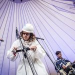 Det samme gælder antageligt Clausen, som jeg kortvarigt tror har forladt scenen for at give instrumentparken fuldt råderum uden vokalbidrag. Der går dog ikke mange øjeblikke, før han popper op på en olietønde ude i flokken, hvorfra han supplerer de tre på scenen til den luftigt hvirvlende og herligt iørefaldende “Amerika”.