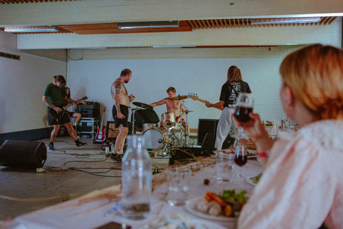 Jeg sætter mig på bænken foran en vilkårlig tallerken på pladsen tættest ved forstærkerne og trommesættet. Der er dækket op til lige knapt tyve gæster i det lige lovligt oplyste, men ellers fint pyntede lokale. Foran mig ligger et kort med dagens menu samt et sæt ørepropper. Er det her en middag eller et metalshow? Er det her en mad- eller koncertanmeldelse? Bare rolig. Jeg befinder mig på ALTER 2022, og her er der ikke noget enten eller. Her er både og.