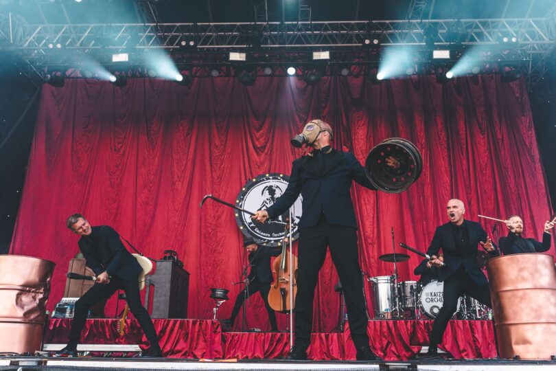 Livet er bare ikke fair. For en halv time siden stod solen højt på himmelen, og det netop ankomne publikum på årets NorthSide Festival var ikke til at skyde igennem. Men det danske sommervejr er vel nok indbegrebet af blandet, og nu tager vinden til, skyerne truer, og selvfølgelig drypper det også. Det ser sort ud, men da Omen Kaizer (Helge Risa, der nok bedst er kendt for sine talenter på pumpeorgelet) indtager scenen med gasmaske og attachemappe til de noget nær perfekt-til-anledningen-toner af Tom Waits’ ”Russian Dance”, så trækker det dårlige vejr følehornene til sig. Det er 11 år siden, at Kaizers Orchestra sidst spillede på den århusianske festival. Deres genkomst tør selv ikke en vejrgud stikke en kæp i hjulet på.