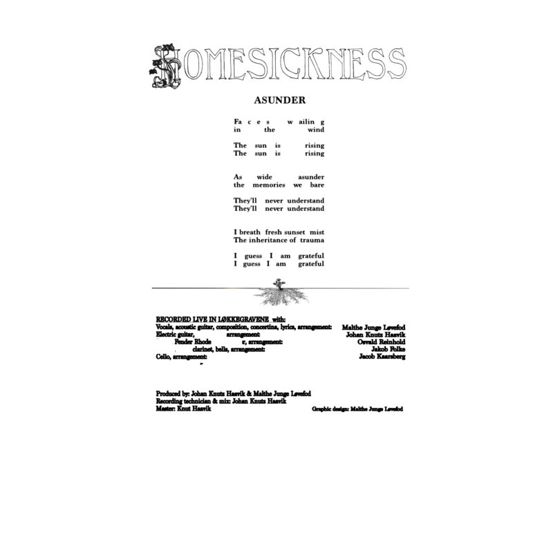Jeg har ofte hørt, at hvis man føler sig deprimeret efter vinterhalvårets frembrud, så er det fordi, at man er særligt afhængig af D-vitamin fra solen – selvom der godt nok er delte holdninger omkring den tese. Uanset hvad, så har jeg fundet en langt bedre kur mod vinterdepression. Fremfor at hungre efter lyset, så kan du roligt overgive dig til nattens melankolske mulm og mørke, mens du lytter til Homesickness’ nye single “Asunder”. Tonerne fra en velstemt, akustisk guitar og en skrøbelig vokal griber dit bedrøvede sind og minder dig om, at det er okay at være lidt deprimeret.