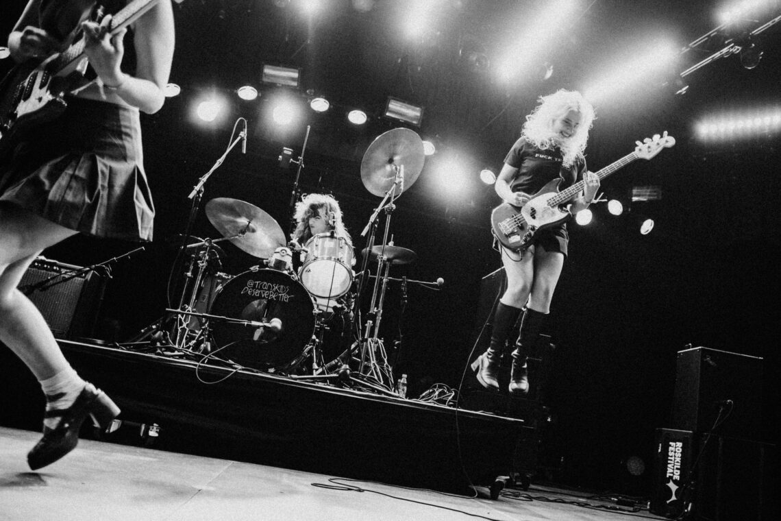 Hvis man fortsat havde mod på mere (og gerne endnu vildere), var der en absolut sidste chance for at te sig åndssvagt på Gaia i selskab med britiske Lambrini Girls‘ korte, intense festfyrværkeri af et punkpunktum. Den antifascistiske/feministiske punktrio har taget akkurat samme spring som Fontaines D.C. gjorde i 2019 – Ideal Bar tidligt på året efterfulgt af deres Roskilde Festival-debut på en af festivalens mindre scener samme sommer – men modsat irernes lidt tillukkede forestilling for seks år siden var Lambrini Girls ude i fjæset på publikum fra det øjeblik, de sparkede sættet i gang med “Big Dick Energy”.